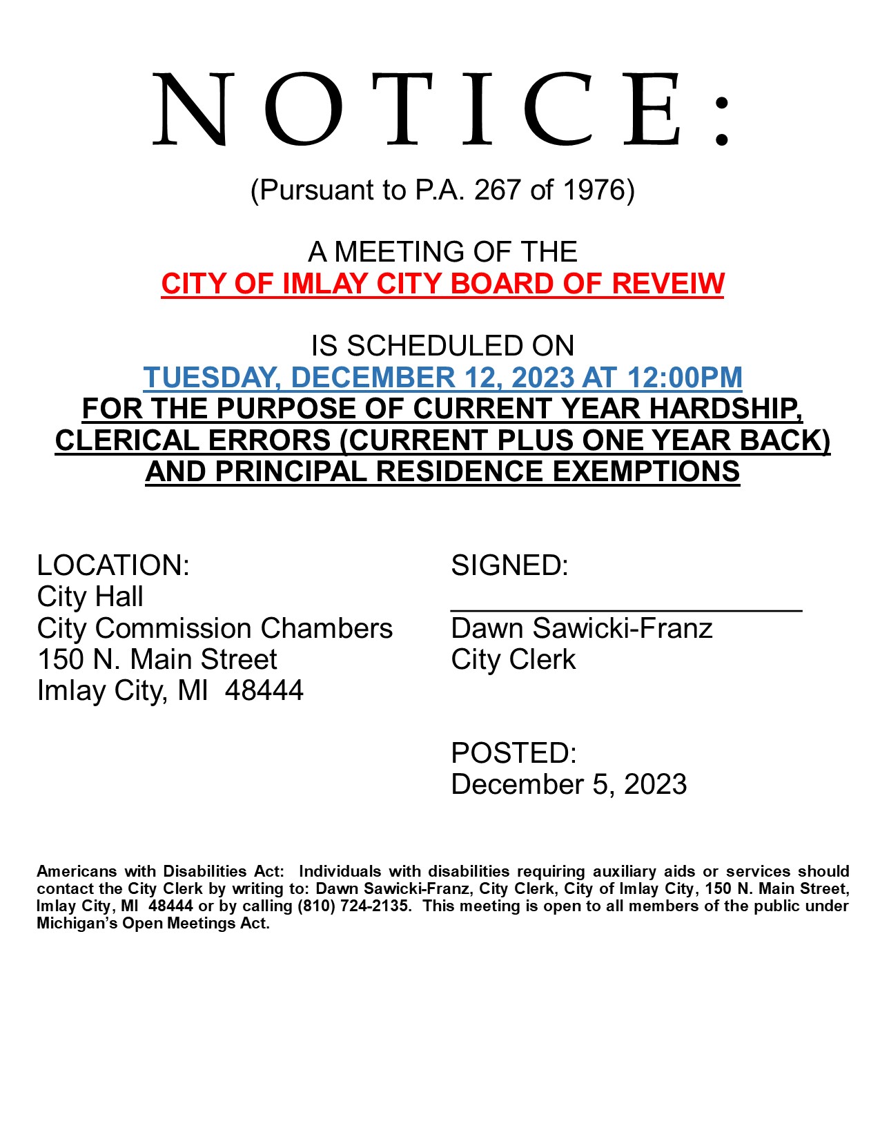 Board of Review Meeting – December 12th, 2023 at 12:00PM