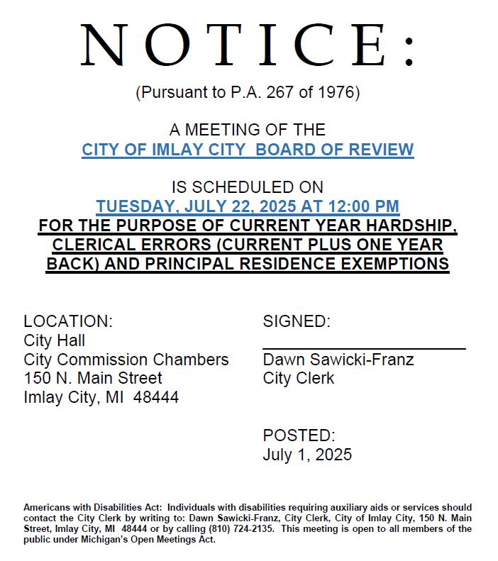 Board of Review Meeting on Tuesday, July 22nd at 12:00PM