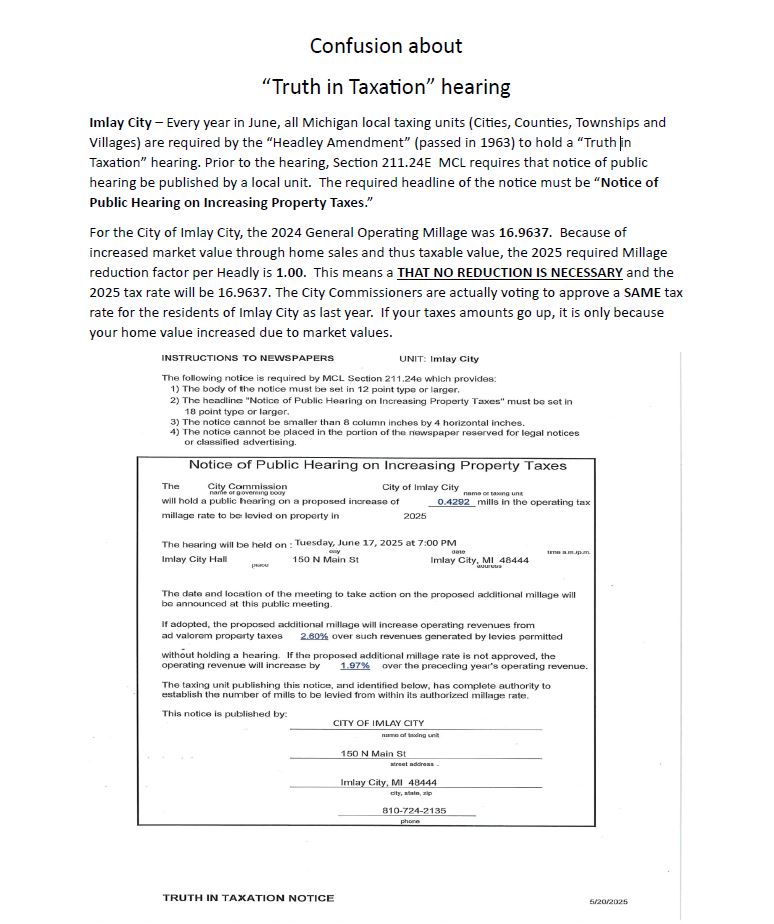 Truth in Taxation hearing notice for Imlay City, 2025.