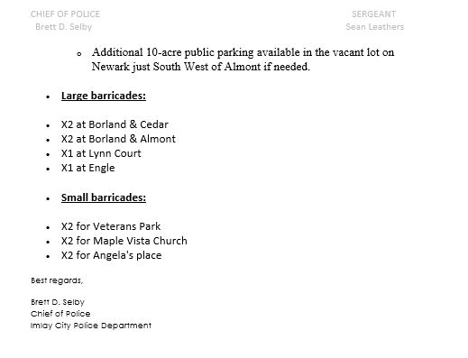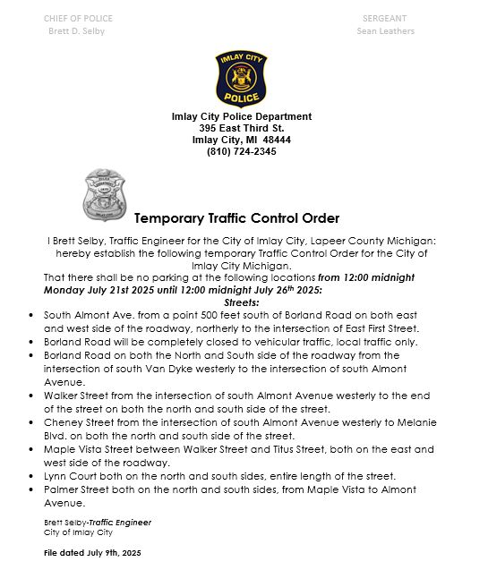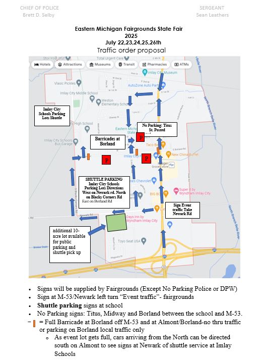Imlay City temporary traffic control order information.Traffic order map for Eastern Michigan Fair 2025.Parking and barricade locations memo from Chief of Police.