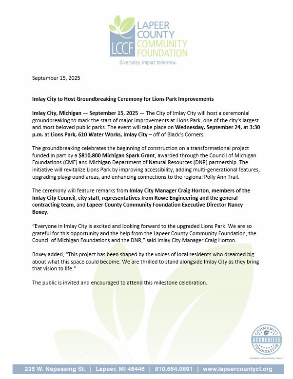 Flyer for Imlay City Lions Park groundbreaking event.