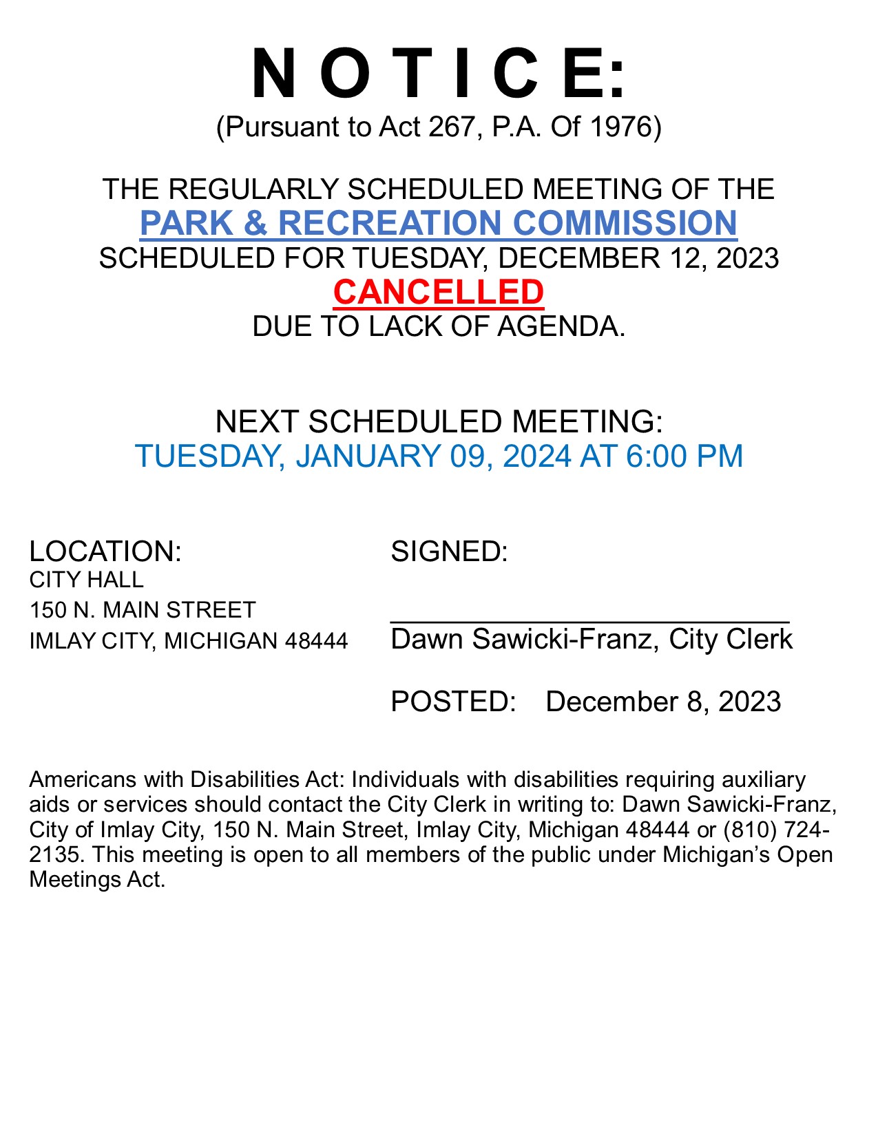 Parks & Recreation Commission Meeting CANCELLED – December 12th, 2023