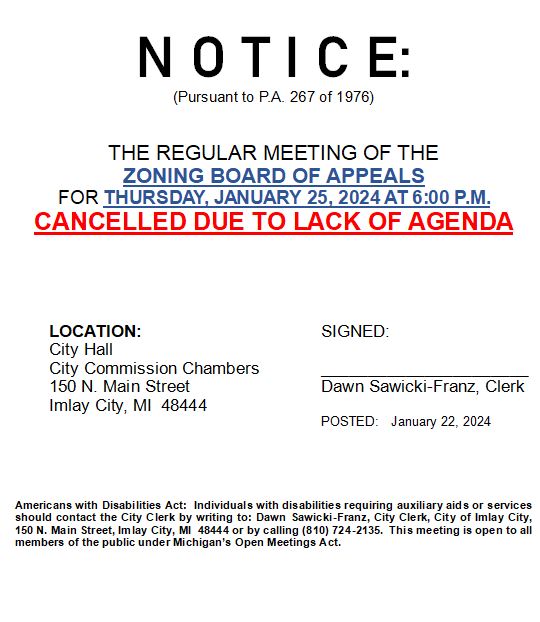 Zoning Board of Appeals Meeting 1/25 CANCELLED