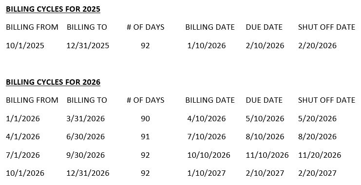 Utility billing mail dates are January 10, April 10, July 10, October 10